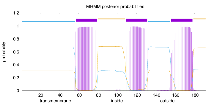 inside 1 - 56 TMhelix 57 - 79 outside 80 - 108 TMhelix 109 - 131 inside 132 - 155 TMhelix 156 - 178 outside 179 - 192 |