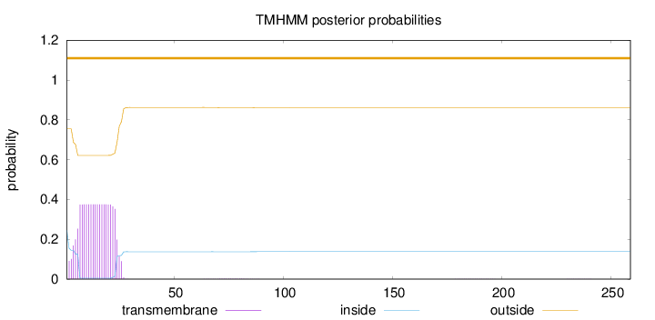 outside 1 - 41 TMhelix 42 - 64 inside 65 - 76 TMhelix 77 - 99 outside 100 - 159 |