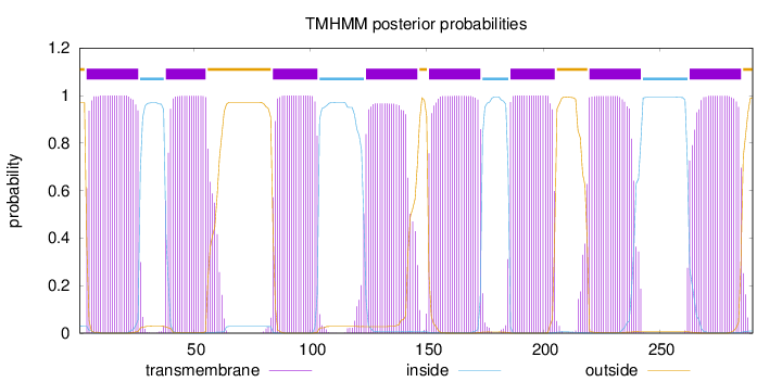 outside 1 - 3 TMhelix 4 - 26 inside 27 - 37 TMhelix 38 - 55 outside 56 - 83 TMhelix 84 - 103 inside 104 - 123 TMhelix 124 - 146 outside 147 - 150 TMhelix 151 - 173 inside 174 - 185 TMhelix 186 - 205 outside 206 - 219 TMhelix 220 - 242 inside 243 - 262 TMhelix 263 - 285 outside 286 - 290 |