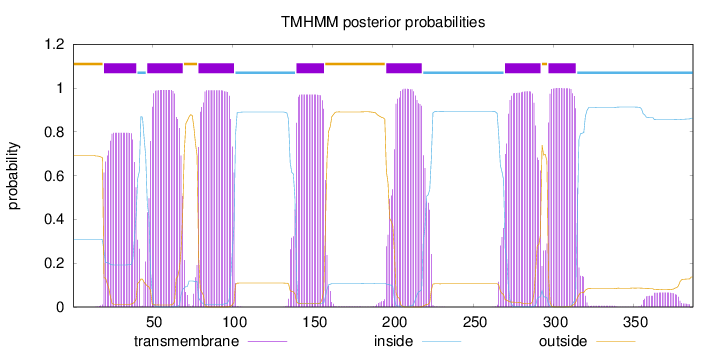 outside 1 - 19 TMhelix 20 - 40 inside 41 - 46 TMhelix 47 - 69 outside 70 - 78 TMhelix 79 - 101 inside 102 - 139 TMhelix 140 - 157 outside 158 - 195 TMhelix 196 - 218 inside 219 - 269 TMhelix 270 - 292 outside 293 - 296 TMhelix 297 - 314 inside 315 - 387 |