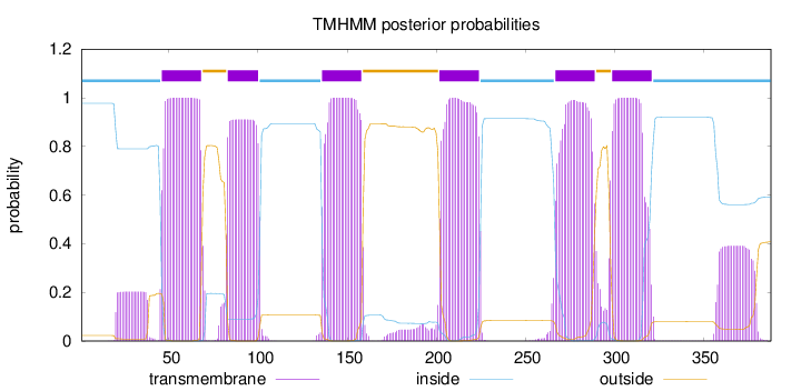 inside 1 - 45 TMhelix 46 - 68 outside 69 - 82 TMhelix 83 - 100 inside 101 - 135 TMhelix 136 - 158 outside 159 - 201 TMhelix 202 - 224 inside 225 - 266 TMhelix 267 - 289 outside 290 - 298 TMhelix 299 - 321 inside 322 - 388 |