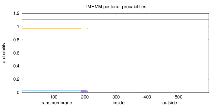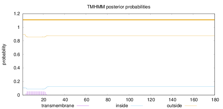 outside 1 - 24 TMhelix 25 - 47 inside 48 - 59 TMhelix 60 - 82 outside 83 - 101 TMhelix 102 - 124 inside 125 - 143 TMhelix 144 - 166 outside 167 - 213 TMhelix 214 - 236 inside 237 - 282 TMhelix 283 - 305 outside 306 - 314 TMhelix 315 - 337 inside 338 - 374 |