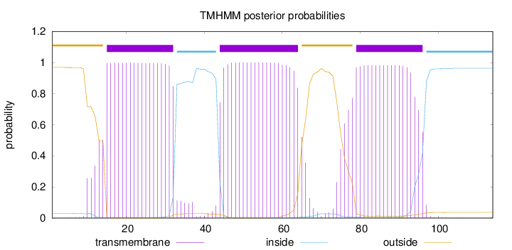 outside 1 - 14 TMhelix 15 - 32 inside 33 - 43 TMhelix 44 - 64 outside 65 - 78 TMhelix 79 - 96 inside 97 - 114 |