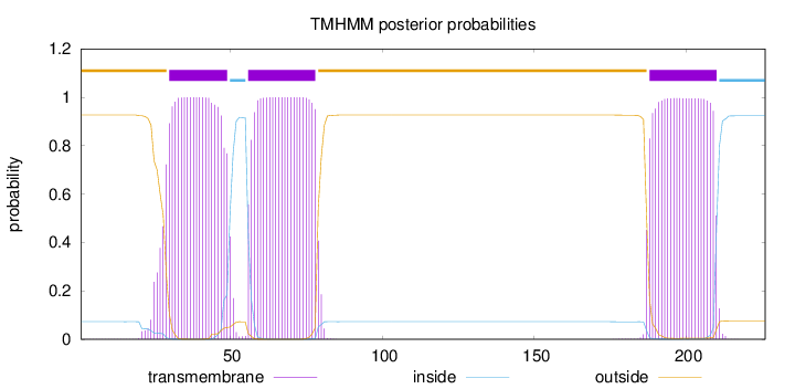 outside 1 - 29 TMhelix 30 - 49 inside 50 - 55 TMhelix 56 - 78 outside 79 - 187 TMhelix 188 - 210 inside 211 - 226 |