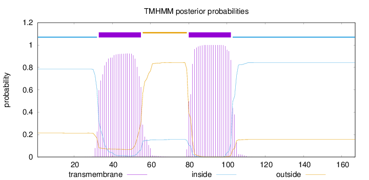 inside 1 - 32 TMhelix 33 - 55 outside 56 - 79 TMhelix 80 - 102 inside 103 - 167 |
