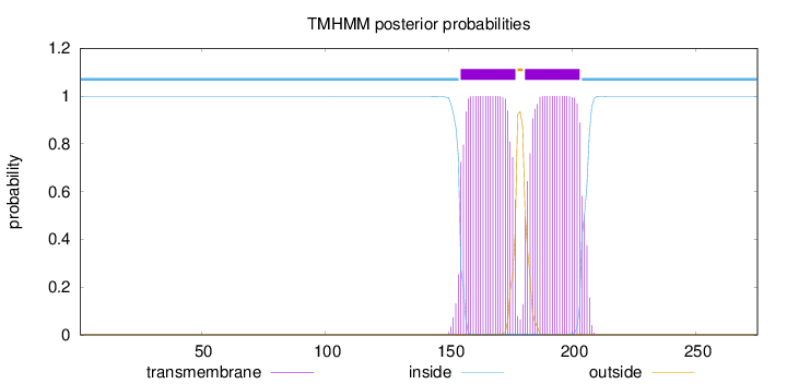inside 1 - 154 TMhelix 155 - 177 outside 178 - 180 TMhelix 181 - 203 inside 204 - 275 |