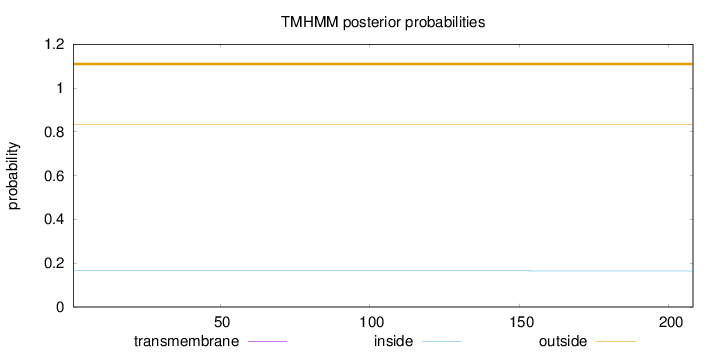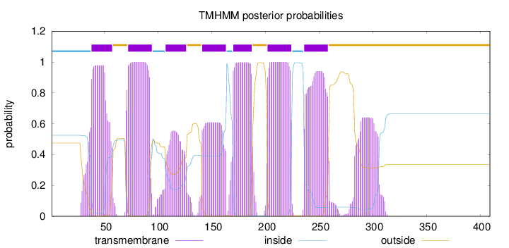 inside 1 - 37 TMhelix 38 - 57 outside 58 - 71 TMhelix 72 - 94 inside 95 - 106 TMhelix 107 - 126 outside 127 - 140 TMhelix 141 - 163 inside 164 - 169 TMhelix 170 - 187 outside 188 - 201 TMhelix 202 - 224 inside 225 - 235 TMhelix 236 - 258 outside 259 - 409 |