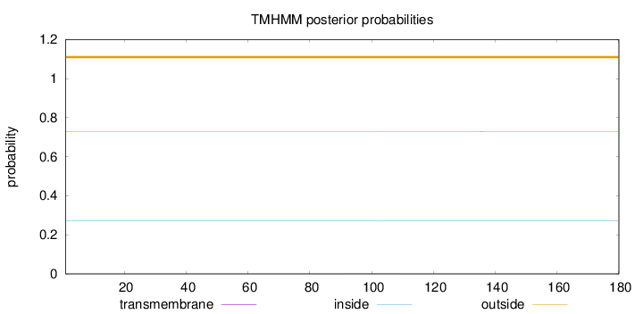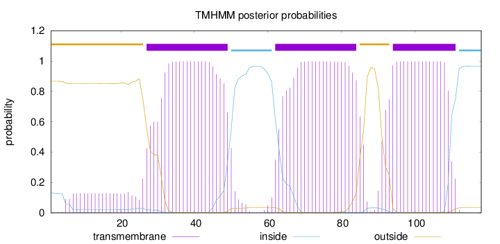 outside 1 - 26 TMhelix 27 - 49 inside 50 - 61 TMhelix 62 - 84 outside 85 - 93 TMhelix 94 - 111 inside 112 - 118 |