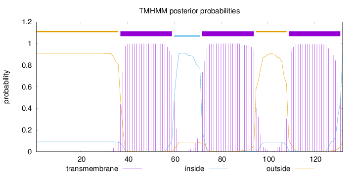 outside 1 - 36 TMhelix 37 - 59 inside 60 - 71 TMhelix 72 - 94 outside 95 - 108 TMhelix 109 - 131 inside 132 - 132 |