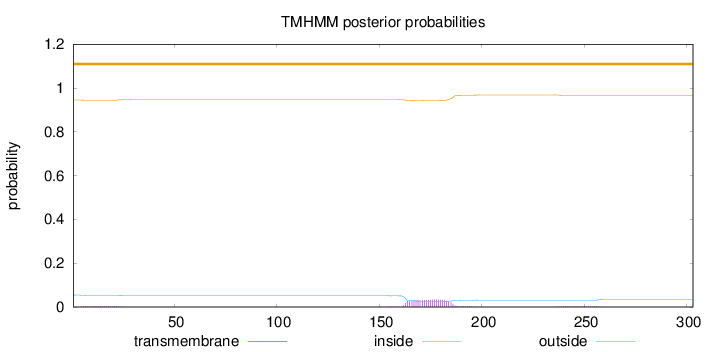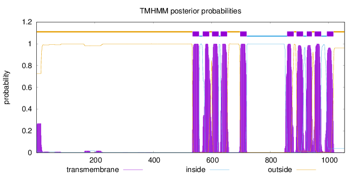 outside 1 - 534 TMhelix 535 - 557 inside 558 - 569 TMhelix 570 - 592 outside 593 - 601 TMhelix 602 - 624 inside 625 - 630 TMhelix 631 - 653 outside 654 - 697 TMhelix 698 - 720 inside 721 - 858 TMhelix 859 - 881 outside 882 - 890 TMhelix 891 - 913 inside 914 - 925 TMhelix 926 - 943 outside 944 - 952 TMhelix 953 - 975 inside 976 - 994 TMhelix 995 - 1017 outside 1018 - 1055 |