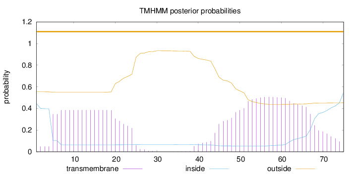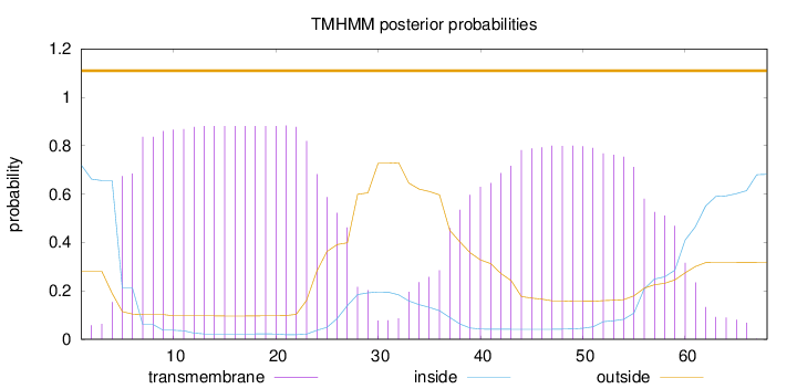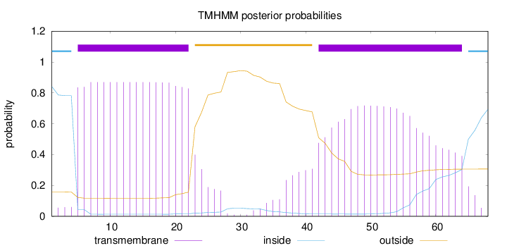 inside 1 - 4 TMhelix 5 - 22 outside 23 - 41 TMhelix 42 - 64 inside 65 - 68 |