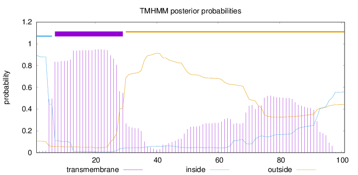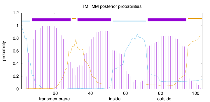 inside 1 - 6 TMhelix 7 - 29 outside 30 - 32 TMhelix 33 - 52 inside 53 - 72 TMhelix 73 - 95 outside 96 - 104 |
