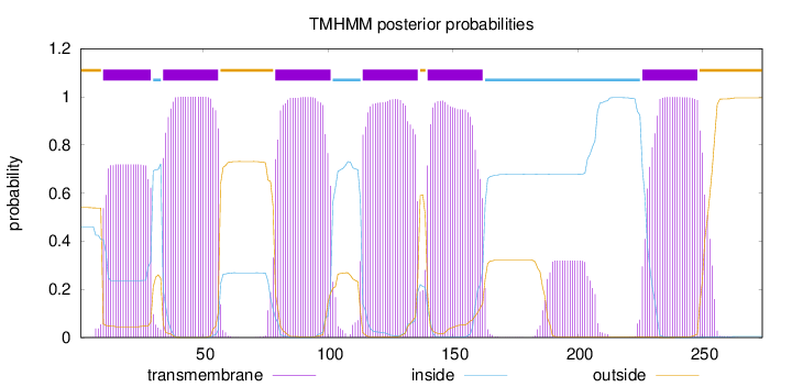 outside 1 - 9 TMhelix 10 - 29 inside 30 - 33 TMhelix 34 - 56 outside 57 - 78 TMhelix 79 - 101 inside 102 - 113 TMhelix 114 - 136 outside 137 - 139 TMhelix 140 - 162 inside 163 - 225 TMhelix 226 - 248 outside 249 - 274 |