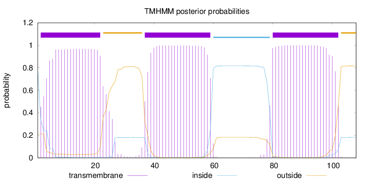 inside 1 - 1 TMhelix 2 - 22 outside 23 - 36 TMhelix 37 - 59 inside 60 - 79 TMhelix 80 - 102 outside 103 - 108 |