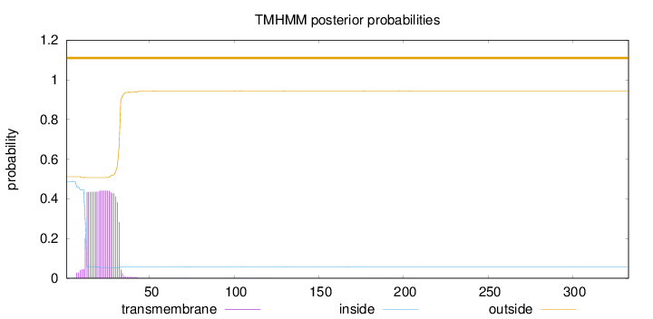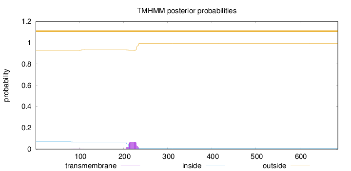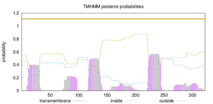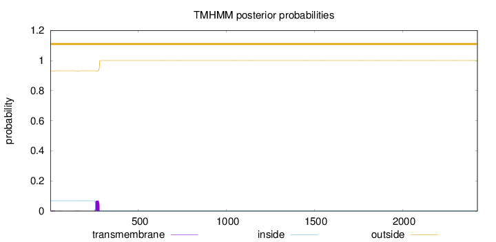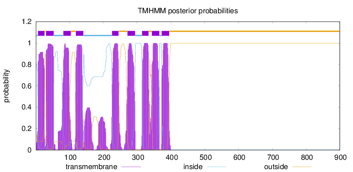 inside 1 - 6 TMhelix 7 - 26 outside 27 - 30 TMhelix 31 - 53 inside 54 - 81 TMhelix 82 - 104 outside 105 - 118 TMhelix 119 - 141 inside 142 - 225 TMhelix 226 - 245 outside 246 - 271 TMhelix 272 - 294 inside 295 - 314 TMhelix 315 - 334 outside 335 - 343 TMhelix 344 - 366 inside 367 - 372 TMhelix 373 - 395 outside 396 - 900 |