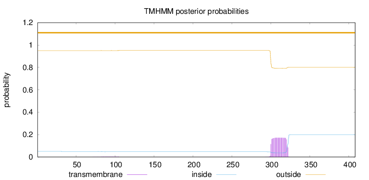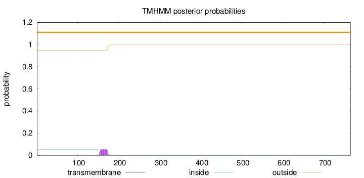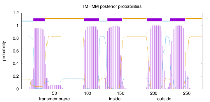 inside 1 - 18 TMhelix 19 - 36 outside 37 - 95 TMhelix 96 - 118 inside 119 - 130 TMhelix 131 - 153 outside 154 - 190 TMhelix 191 - 213 inside 214 - 225 TMhelix 226 - 248 outside 249 - 274 |