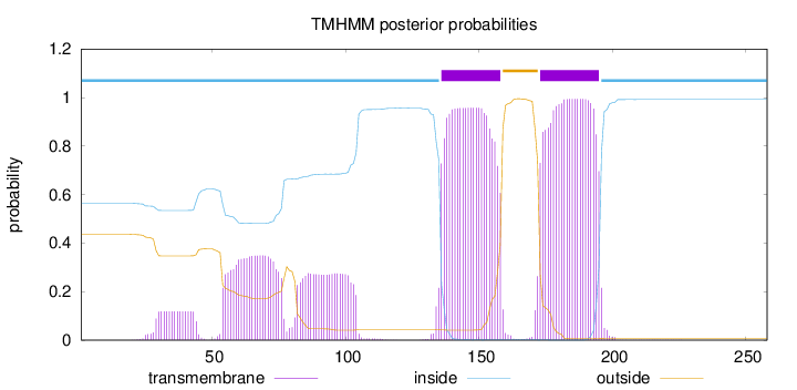 inside 1 - 135 TMhelix 136 - 158 outside 159 - 172 TMhelix 173 - 195 inside 196 - 258 |
