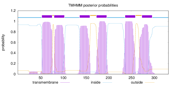 inside 1 - 53 TMhelix 54 - 76 outside 77 - 80 TMhelix 81 - 103 inside 104 - 136 TMhelix 137 - 159 outside 160 - 173 TMhelix 174 - 196 inside 197 - 236 TMhelix 237 - 259 outside 260 - 273 TMhelix 274 - 296 inside 297 - 332 |