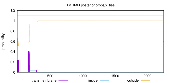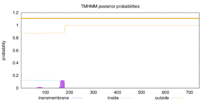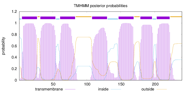 inside 1 - 4 TMhelix 5 - 27 outside 28 - 31 TMhelix 32 - 54 inside 55 - 60 TMhelix 61 - 83 outside 84 - 107 TMhelix 108 - 130 inside 131 - 146 TMhelix 147 - 169 outside 170 - 178 TMhelix 179 - 196 inside 197 - 202 TMhelix 203 - 222 outside 223 - 240 |