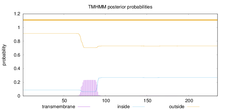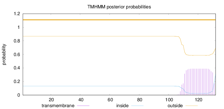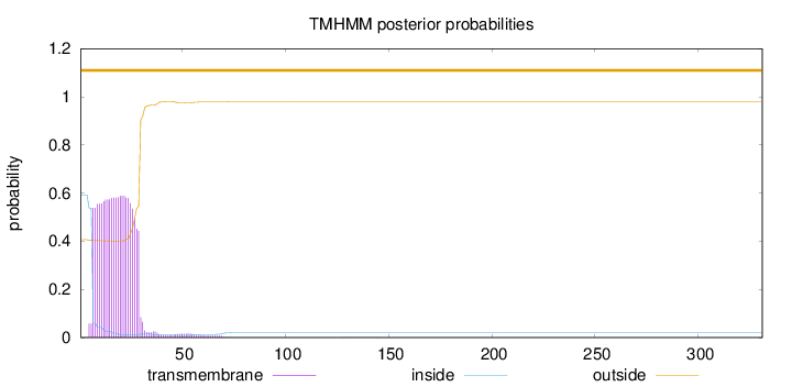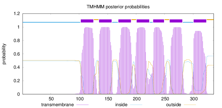 inside 1 - 102 TMhelix 103 - 125 outside 126 - 134 TMhelix 135 - 157 inside 158 - 168 TMhelix 169 - 191 outside 192 - 200 TMhelix 201 - 223 inside 224 - 229 TMhelix 230 - 249 outside 250 - 258 TMhelix 259 - 281 inside 282 - 300 TMhelix 301 - 323 outside 324 - 336 |