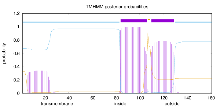 inside 1 - 83 TMhelix 84 - 106 outside 107 - 109 TMhelix 110 - 129 inside 130 - 161 |