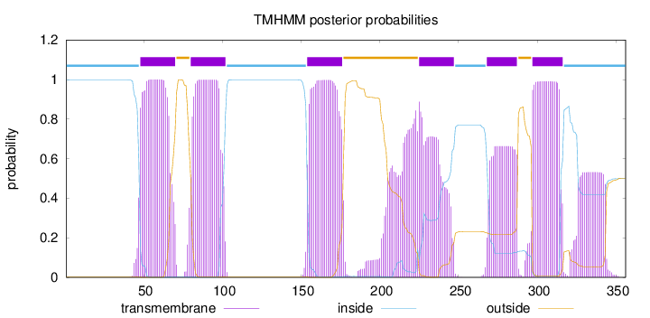 inside 1 - 47 TMhelix 48 - 70 outside 71 - 79 TMhelix 80 - 102 inside 103 - 153 TMhelix 154 - 176 outside 177 - 224 TMhelix 225 - 247 inside 248 - 267 TMhelix 268 - 287 outside 288 - 296 TMhelix 297 - 316 inside 317 - 356 |
