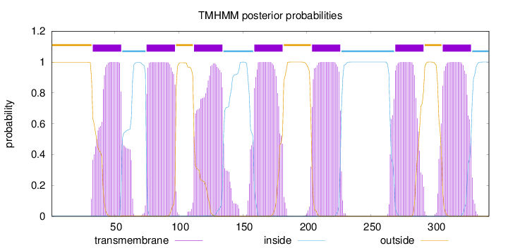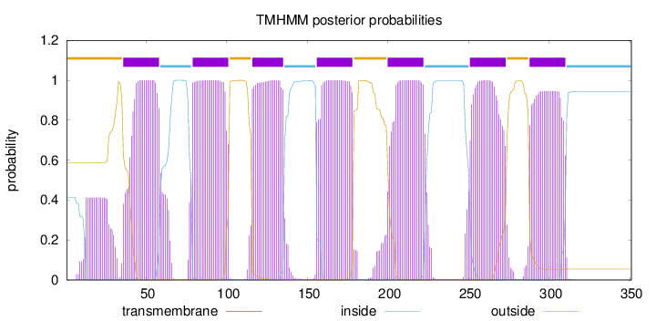 outside 1 - 35 TMhelix 36 - 58 inside 59 - 78 TMhelix 79 - 101 outside 102 - 115 TMhelix 116 - 135 inside 136 - 155 TMhelix 156 - 178 outside 179 - 199 TMhelix 200 - 222 inside 223 - 250 TMhelix 251 - 273 outside 274 - 287 TMhelix 288 - 310 inside 311 - 351 |