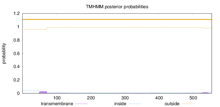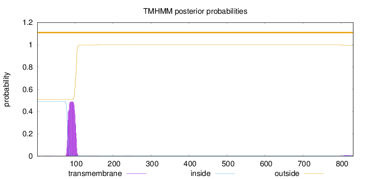 outside 1 - 9 TMhelix 10 - 32 inside 33 - 38 TMhelix 39 - 60 outside 61 - 74 TMhelix 75 - 97 inside 98 - 199 TMhelix 200 - 222 outside 223 - 253 TMhelix 254 - 276 inside 277 - 323 TMhelix 324 - 346 outside 347 - 350 TMhelix 351 - 373 inside 374 - 439 TMhelix 440 - 462 outside 463 - 471 TMhelix 472 - 494 inside 495 - 850 TMhelix 851 - 873 outside 874 - 901 TMhelix 902 - 924 inside 925 - 975 TMhelix 976 - 995 outside 996 - 999 TMhelix 1000 - 1019 inside 1020 - 1082 TMhelix 1083 - 1105 outside 1106 - 1416 |