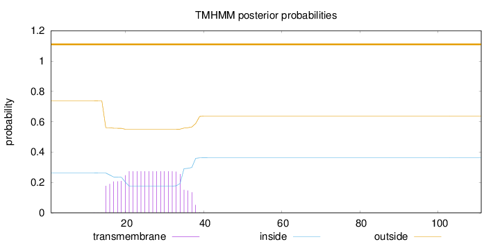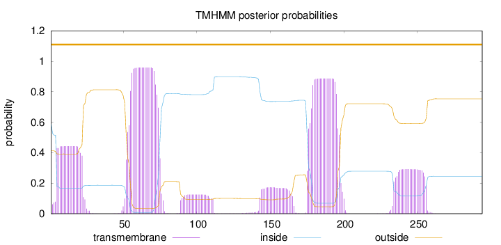 outside 1 - 43 TMhelix 44 - 66 inside 67 - 86 TMhelix 87 - 104 outside 105 - 149 TMhelix 150 - 169 inside 170 - 180 TMhelix 181 - 203 outside 204 - 217 TMhelix 218 - 240 inside 241 - 260 TMhelix 261 - 280 outside 281 - 289 TMhelix 290 - 309 inside 310 - 321 TMhelix 322 - 340 outside 341 - 343 TMhelix 344 - 366 inside 367 - 385 |