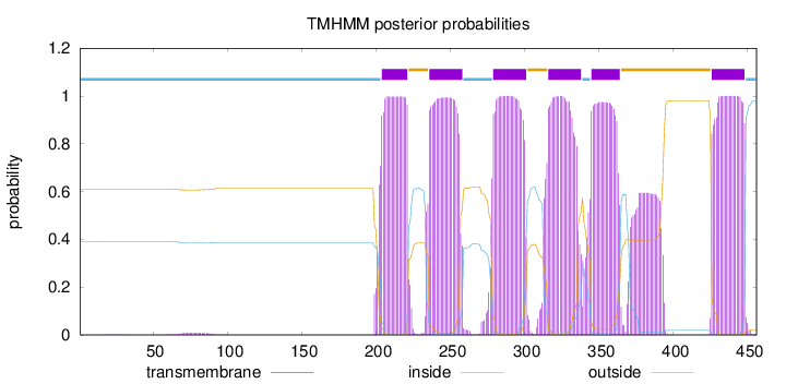 inside 1 - 203 TMhelix 204 - 221 outside 222 - 235 TMhelix 236 - 258 inside 259 - 278 TMhelix 279 - 301 outside 302 - 315 TMhelix 316 - 338 inside 339 - 344 TMhelix 345 - 364 outside 365 - 425 TMhelix 426 - 448 inside 449 - 456 |