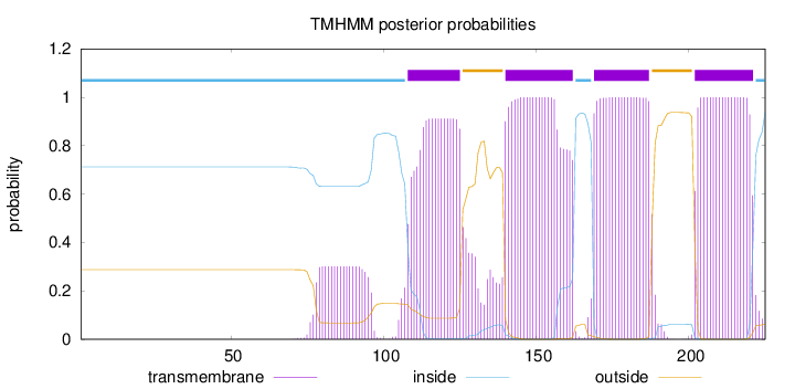 inside 1 - 107 TMhelix 108 - 125 outside 126 - 139 TMhelix 140 - 162 inside 163 - 168 TMhelix 169 - 187 outside 188 - 201 TMhelix 202 - 221 inside 222 - 225 |