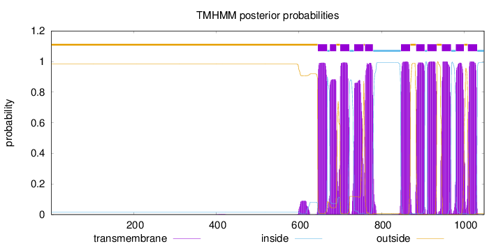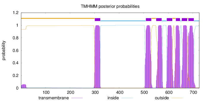 outside 1 - 300 TMhelix 301 - 323 inside 324 - 508 TMhelix 509 - 531 outside 532 - 550 TMhelix 551 - 573 inside 574 - 593 TMhelix 594 - 616 outside 617 - 630 TMhelix 631 - 648 inside 649 - 654 TMhelix 655 - 677 outside 678 - 681 TMhelix 682 - 704 inside 705 - 726 |