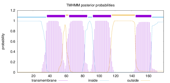 inside 1 - 36 TMhelix 37 - 59 outside 60 - 63 TMhelix 64 - 86 inside 87 - 92 TMhelix 93 - 115 outside 116 - 144 TMhelix 145 - 164 inside 165 - 179 |