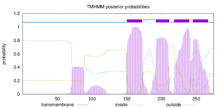inside 1 - 150 TMhelix 151 - 173 outside 174 - 192 TMhelix 193 - 212 inside 213 - 218 TMhelix 219 - 241 outside 242 - 245 TMhelix 246 - 268 inside 269 - 276 |